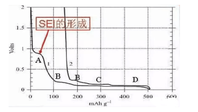 石墨理论容量372mAh/g,当然只有石墨化度非常高的材料才可以达到这个值。但是所有碳素材料在经过首次充放电时都会存在由于副反应带来的不可逆容量损失。随着负极电位的降低,直到电解液中成分在负极表面形成一种稳定的钝化膜(SEI)而停止。首次放电出现四个电压平台(如下图),其中A为SEI的形成,石墨大部分容量在0.3~0.005V范围内。除A之外,不同的电压平台对应着不同的嵌锂状态,分别称之为四阶、三阶化合物…最后形成LiC6,达到理论容量372mAh/g,晶面间距变为0.37。(来源于书本期刊,不懂勿喷!)
