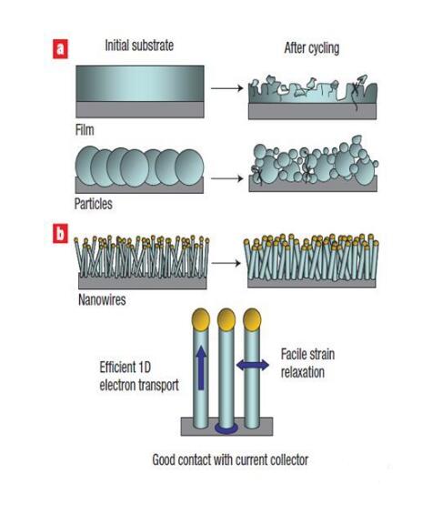 纳米硅,通过制备成纳米线,使得所有的硅得到利用,并预留膨胀空间,可有效改善循环性能。但是该方法成本较高,工艺制程复杂,制备难度较大。